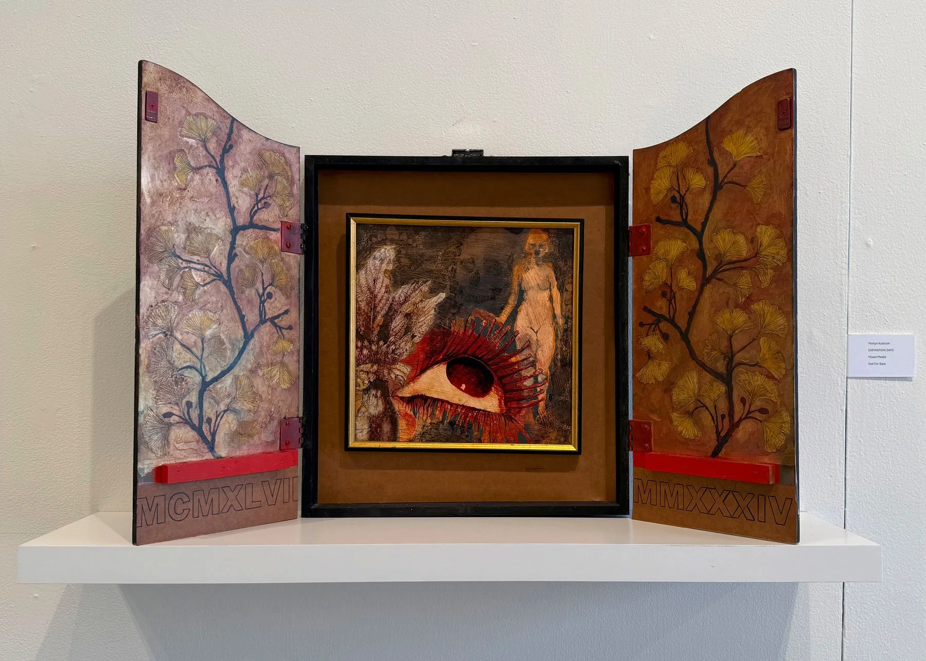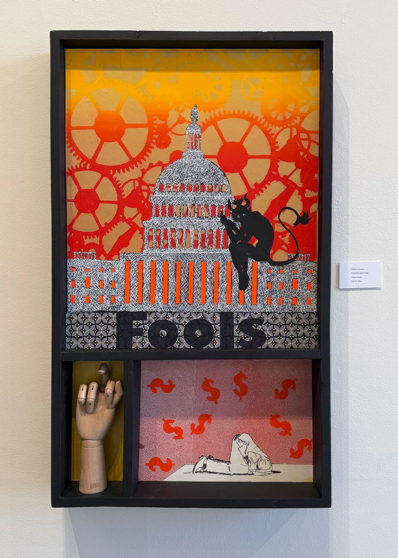 Kubicek is a long-standing member of Five15Arts and her work utilizes recurring images of skeletons, the human body and her political views.