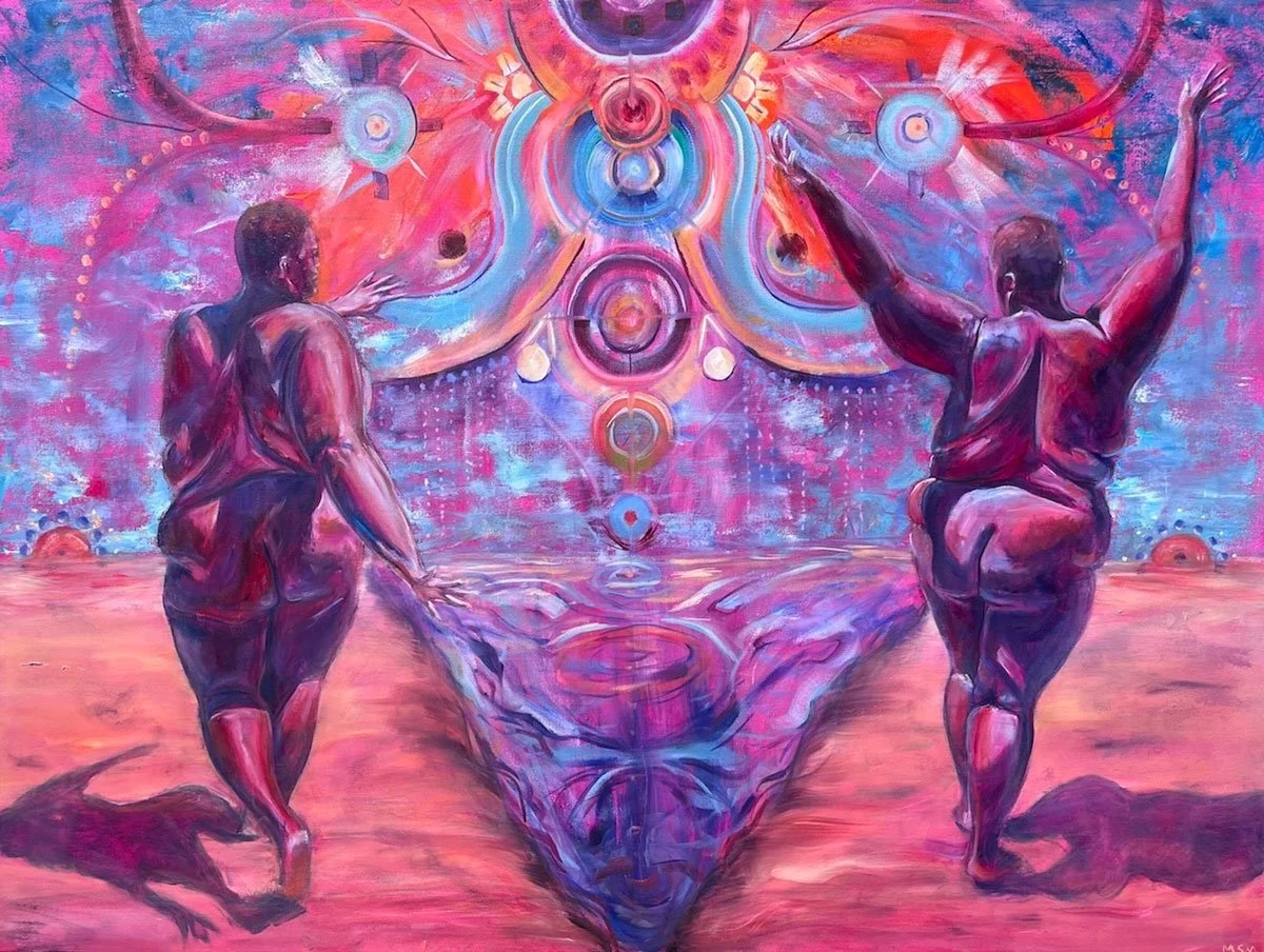 Marisa plays between realism and abstraction while growing the painting out from the body through contemplation on the fleshiness of pleasure, the innate erotic intelligence of life, and the breaking apart of ancestral shame. She stays dedicated to a wild color palette that celebrates the chaotic and the sensual while existing as big, resounding, joyful laughter in the face of western chromophobia.