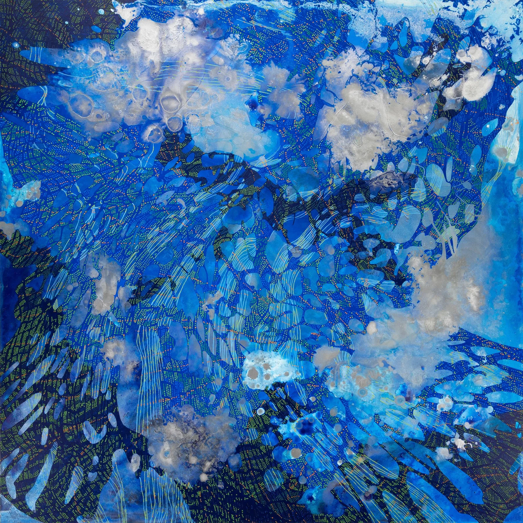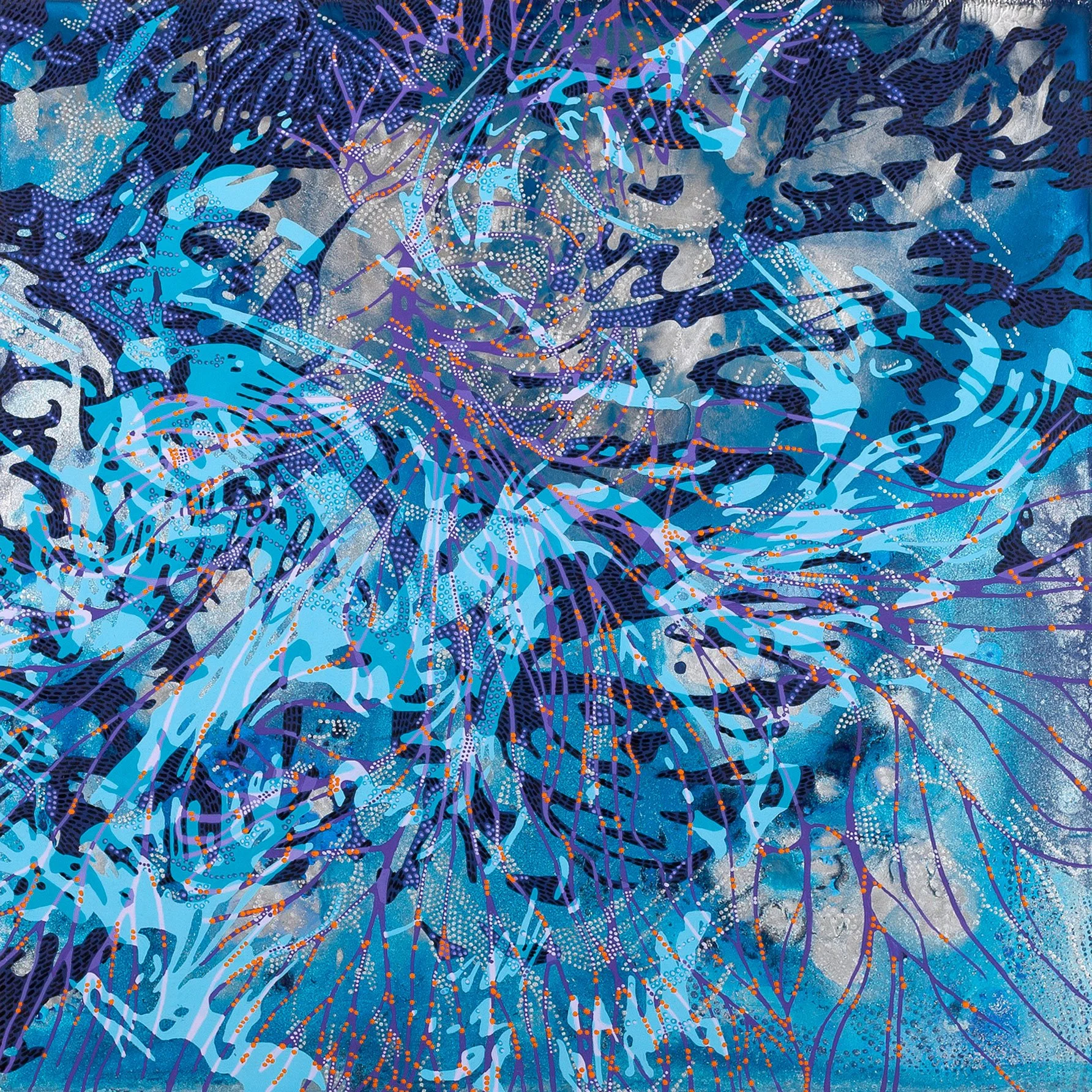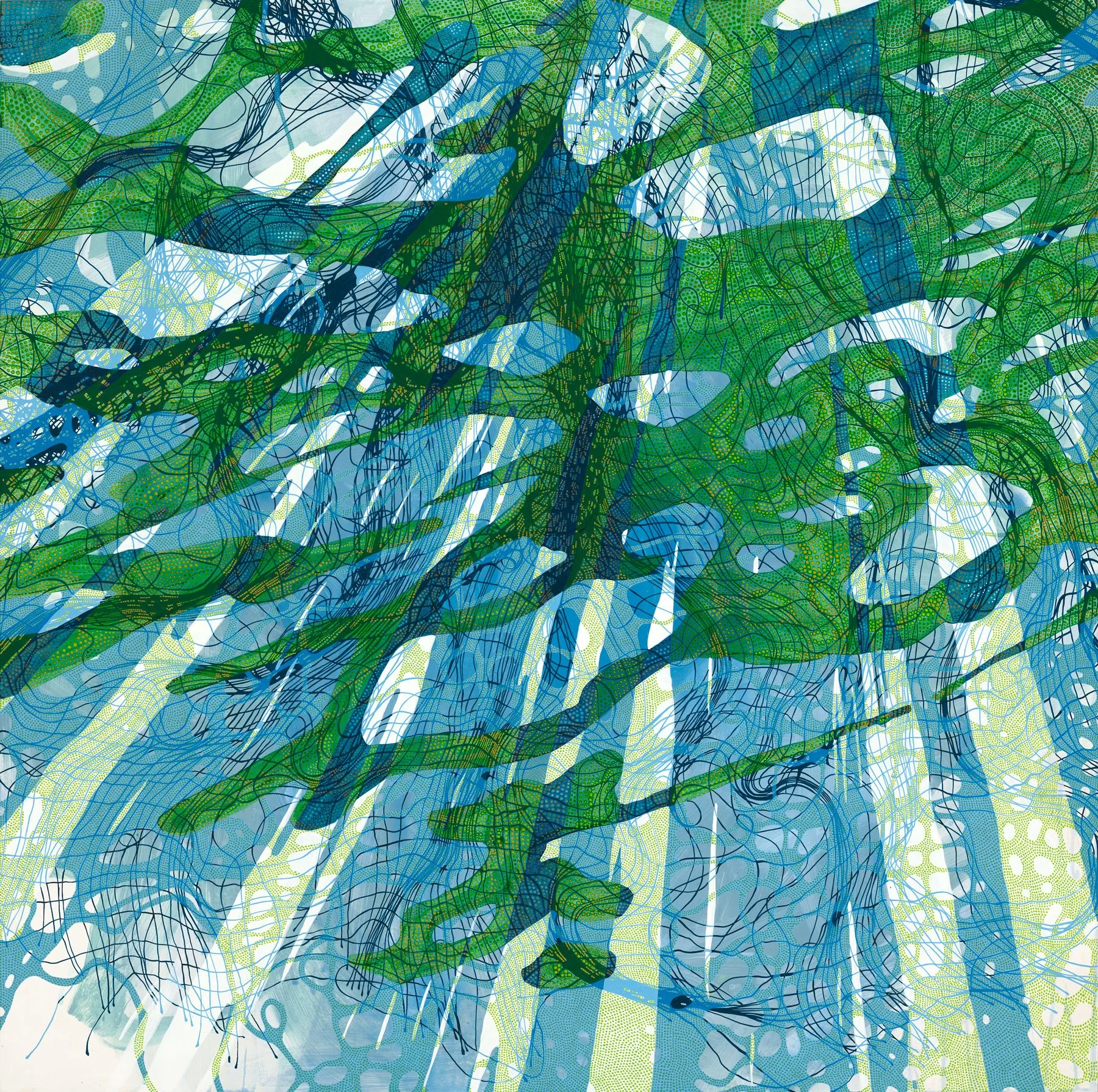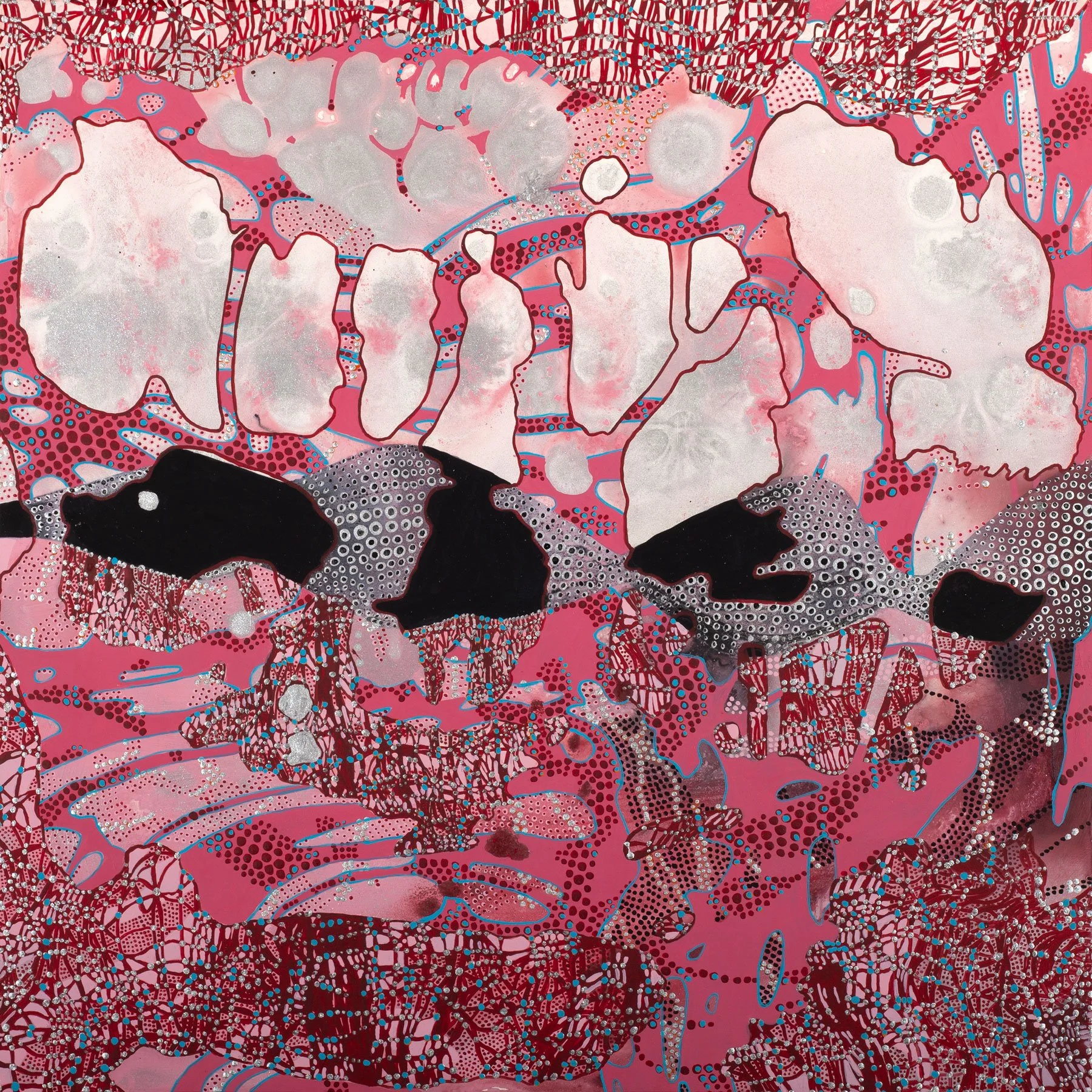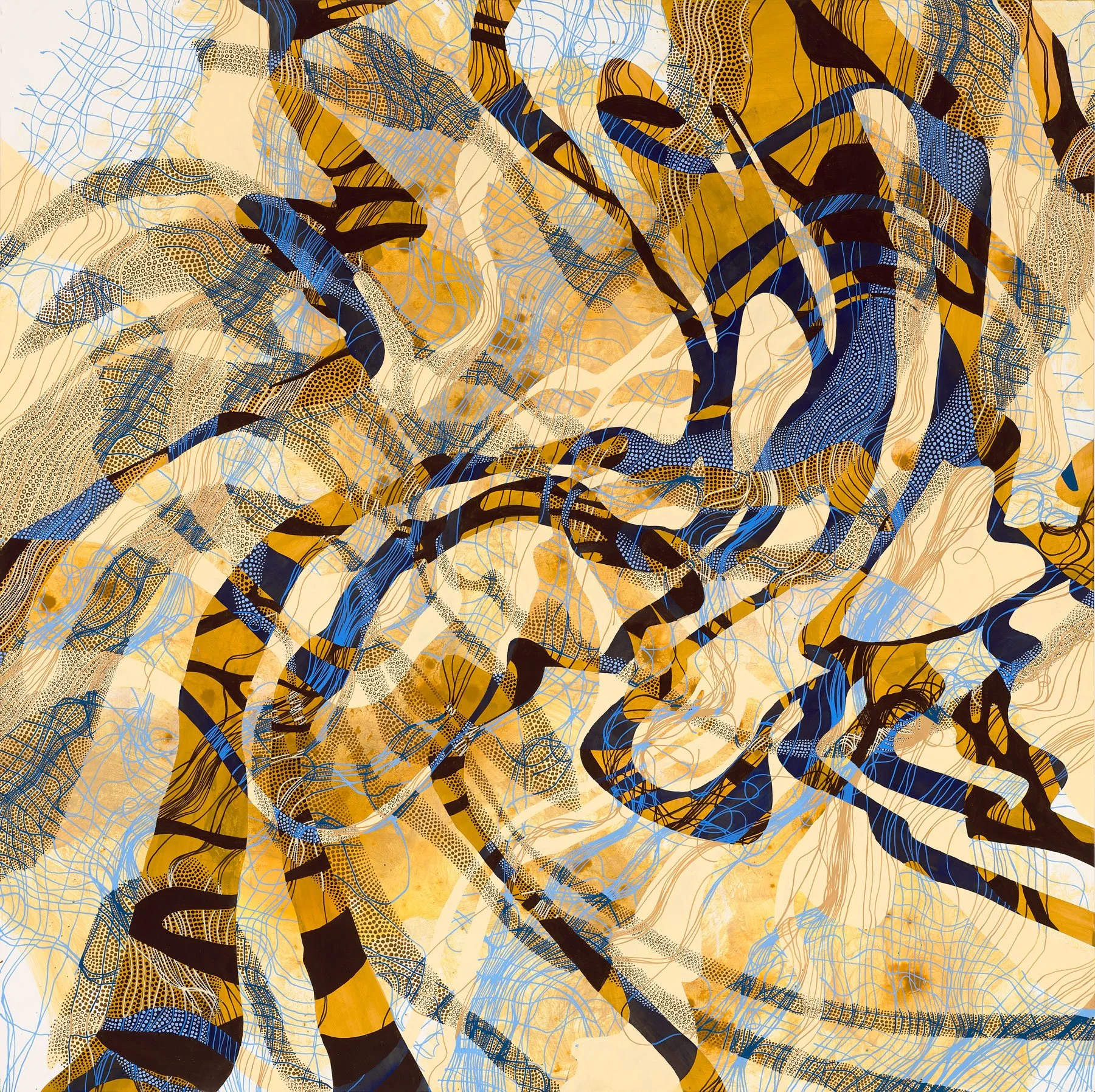 This body of work delves into the concept of repetition as a structural, metaphysical, and psychological paradigm. Each painting starts with a single wet layer—an undefined organic form that acts as the foundation of a larger inner landscape—an interconnected whole. The originating organic form is loosely traced, and the resulting shapes are repeated across the surface, layer by layer, in various orientations, sizes, and patterns. Although the shape remains constant, its influence evolves as it overlaps and interacts with previous elements.